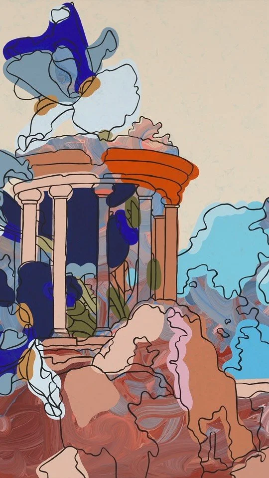 Using digital media and working with acrylic paint on ply board, I pay homage to my Greek roots by exploring and reinterpreting ancient architectural forms of the past.